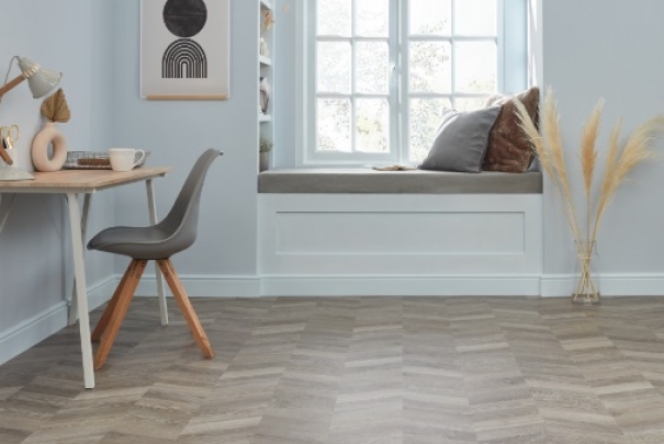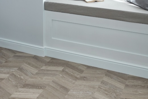 The varying mixture of cloudy grey tones, silver undertones and subtle grain details of our Grey Washed Oak is now available in a distinctive and playful chevron design. Reproducing an iconic chevron pattern in a convenient larger sized plank (48" x 9") with a smooth emboss, this is the perfect choice for projects where installation time is key.
